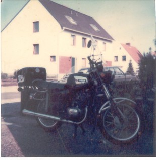 Geliefert wurde sie in rot. Aber die Lackierung taugte nichts. Also wurden schon nach einem halben Jahr Tank, Seitendeckel, hinters Schutzblech und Scheinwerfer in schwarz lackiert. Damit die Farbe dieses Mal besser hielt, wurden die Teile in Mutterns Backofen bei 80 Grad eingebrannt. Bloß gut, daß Mama nicht zuhause war ;-)